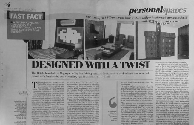 Abhishek Dani Design was covered in Times of India News Paper for creating dynamic interiors for our most respectful client Mr. Hitesh Bhatt in Bungalow is located in Wadgaon Sheri, Pune.